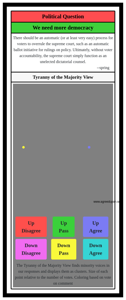 The Tyranny of the Majority View finds minority voices in our responses and displays them as clusters. Size of each point relative to the number of votes. Coloring based on vote on comment