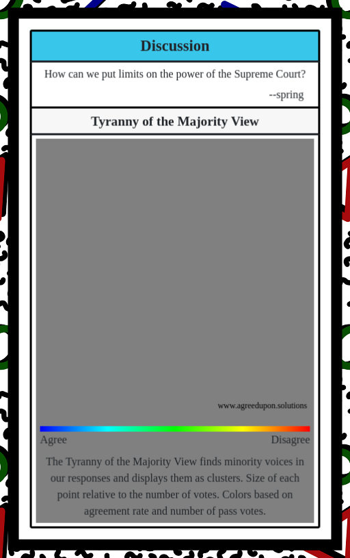 The Tyranny of the Majority View finds minority voices in our responses and displays them as clusters. Size of each point relative to the number of votes. Colors based on agreement rate and number of pass votes.