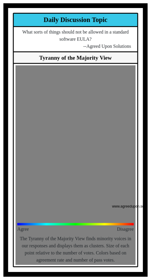 The Tyranny of the Majority View finds minority voices in our responses and displays them as clusters. Size of each point relative to the number of votes. Colors based on agreement rate and number of pass votes.