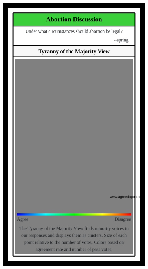The Tyranny of the Majority View finds minority voices in our responses and displays them as clusters. Size of each point relative to the number of votes. Colors based on agreement rate and number of pass votes.