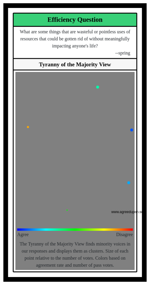The Tyranny of the Majority View finds minority voices in our responses and displays them as clusters. Size of each point relative to the number of votes. Colors based on agreement rate and number of pass votes.