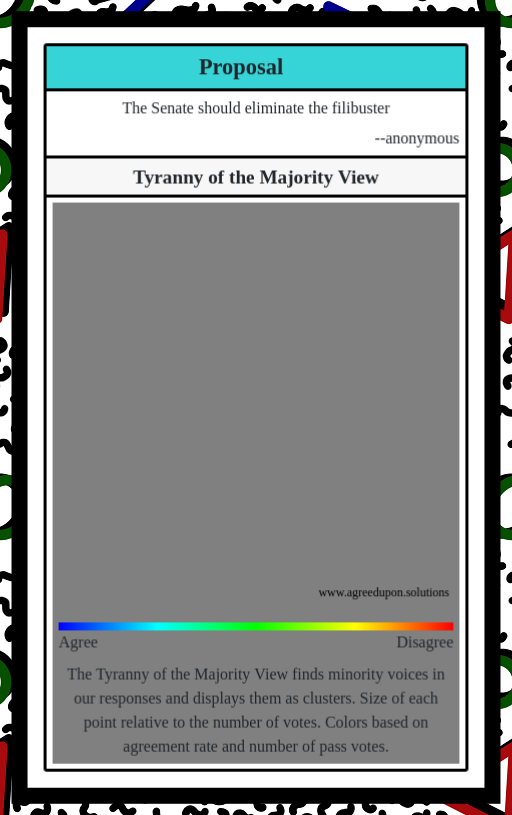 The Tyranny of the Majority View finds minority voices in our responses and displays them as clusters. Size of each point relative to the number of votes. Colors based on agreement rate and number of pass votes.