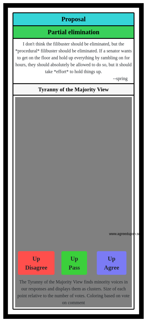 The Tyranny of the Majority View finds minority voices in our responses and displays them as clusters. Size of each point relative to the number of votes. Coloring based on vote on comment