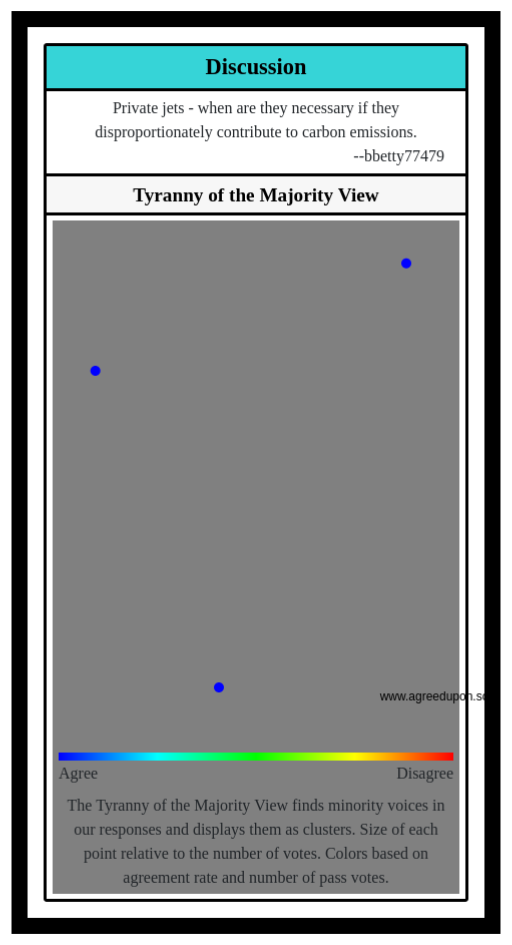 The Tyranny of the Majority View finds minority voices in our responses and displays them as clusters. Size of each point relative to the number of votes. Colors based on agreement rate and number of pass votes.