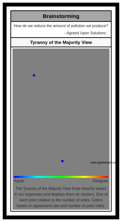 The Tyranny of the Majority View finds minority voices in our responses and displays them as clusters. Size of each point relative to the number of votes. Colors based on agreement rate and number of pass votes.