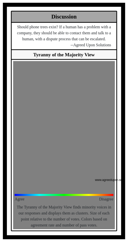 The Tyranny of the Majority View finds minority voices in our responses and displays them as clusters. Size of each point relative to the number of votes. Colors based on agreement rate and number of pass votes.
