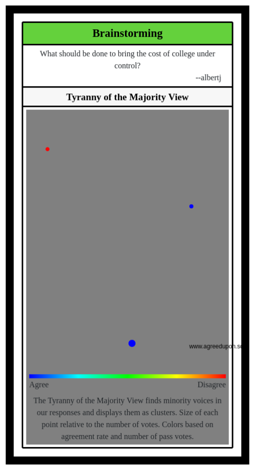 The Tyranny of the Majority View finds minority voices in our responses and displays them as clusters. Size of each point relative to the number of votes. Colors based on agreement rate and number of pass votes.