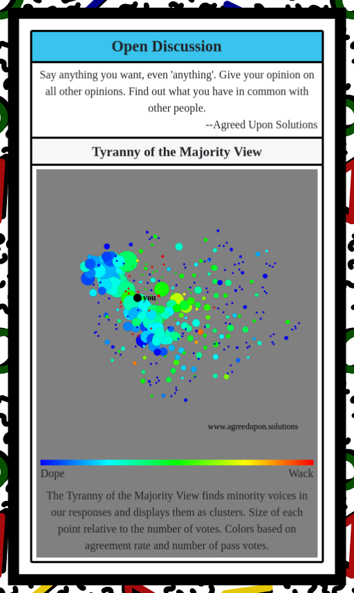 The Tyranny of the Majority View finds minority voices in our responses and displays them as clusters. Size of each point relative to the number of votes. Colors based on agreement rate and number of pass votes.