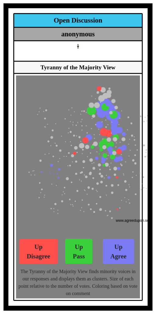 The Tyranny of the Majority View finds minority voices in our responses and displays them as clusters. Size of each point relative to the number of votes. Coloring based on vote on comment