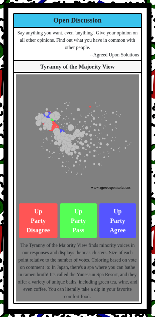 The Tyranny of the Majority View finds minority voices in our responses and displays them as clusters. Size of each point relative to the number of votes. Coloring based on vote on comment