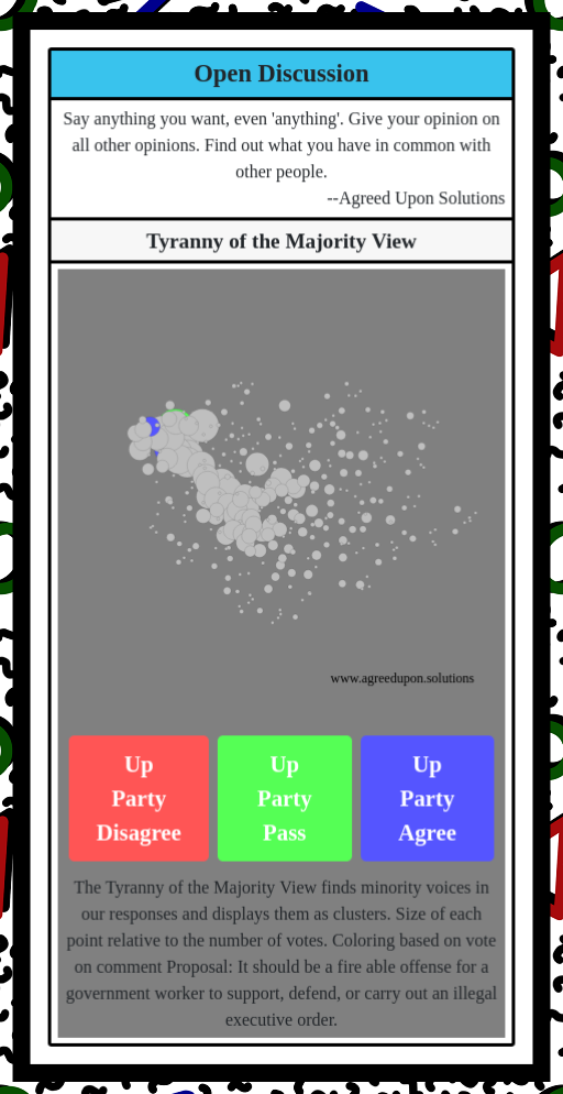 The Tyranny of the Majority View finds minority voices in our responses and displays them as clusters. Size of each point relative to the number of votes. Coloring based on vote on comment