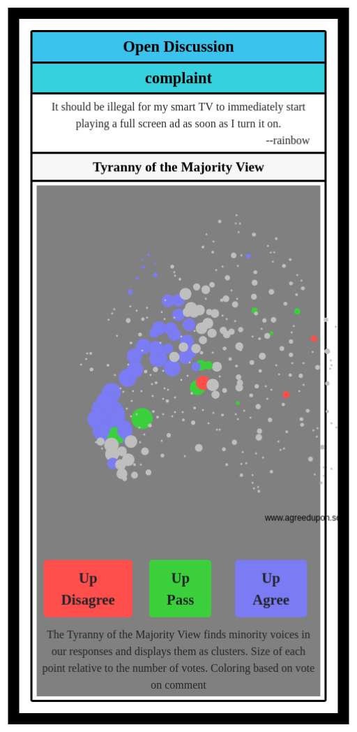 The Tyranny of the Majority View finds minority voices in our responses and displays them as clusters. Size of each point relative to the number of votes. Coloring based on vote on comment
