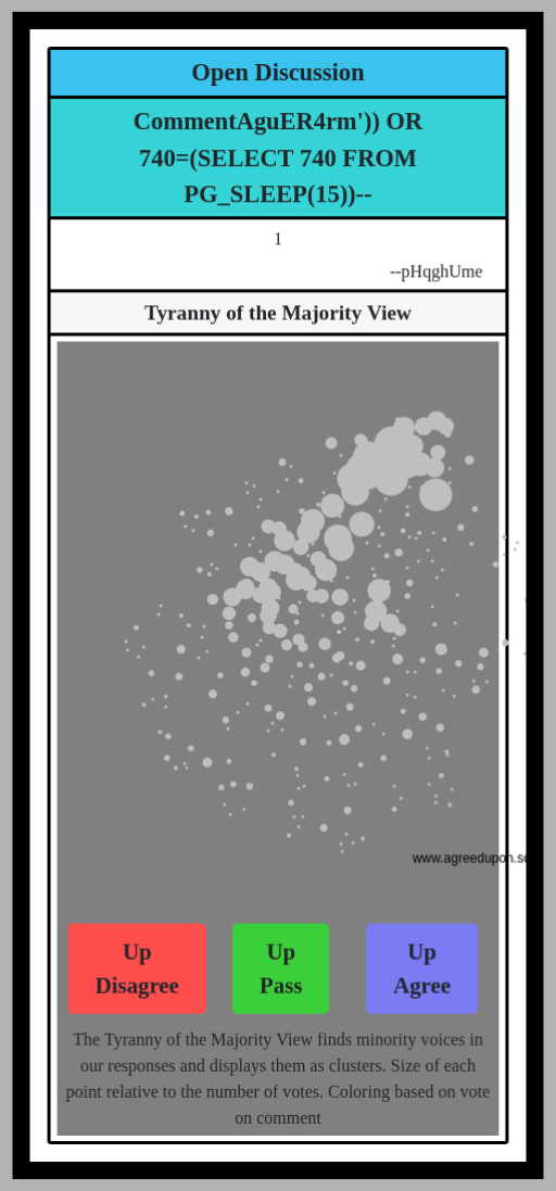 The Tyranny of the Majority View finds minority voices in our responses and displays them as clusters. Size of each point relative to the number of votes. Coloring based on vote on comment