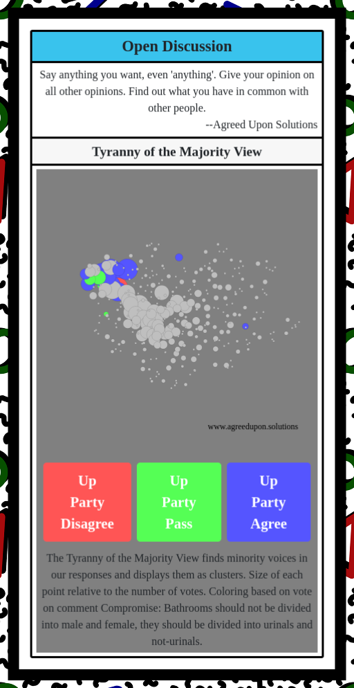 The Tyranny of the Majority View finds minority voices in our responses and displays them as clusters. Size of each point relative to the number of votes. Coloring based on vote on comment