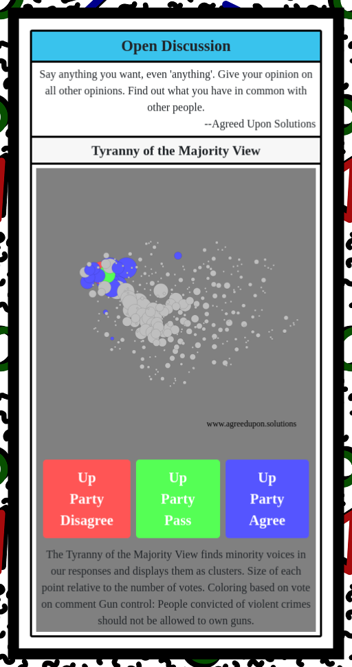 The Tyranny of the Majority View finds minority voices in our responses and displays them as clusters. Size of each point relative to the number of votes. Coloring based on vote on comment