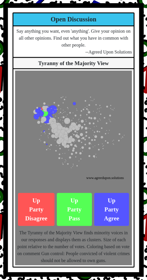 The Tyranny of the Majority View finds minority voices in our responses and displays them as clusters. Size of each point relative to the number of votes. Coloring based on vote on comment