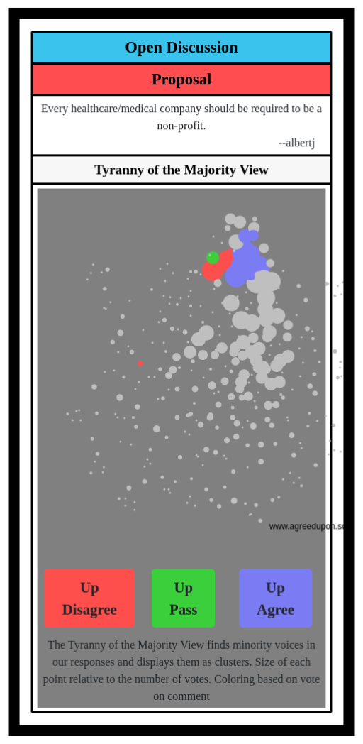 The Tyranny of the Majority View finds minority voices in our responses and displays them as clusters. Size of each point relative to the number of votes. Coloring based on vote on comment