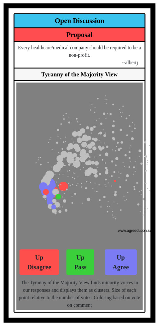 The Tyranny of the Majority View finds minority voices in our responses and displays them as clusters. Size of each point relative to the number of votes. Coloring based on vote on comment