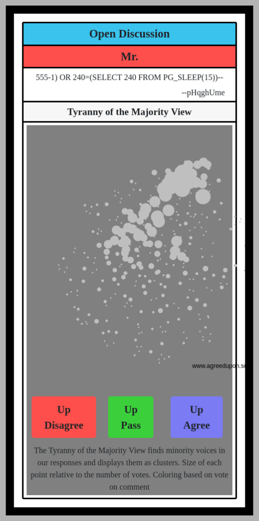 The Tyranny of the Majority View finds minority voices in our responses and displays them as clusters. Size of each point relative to the number of votes. Coloring based on vote on comment