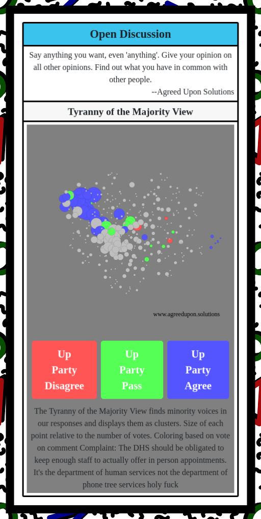 The Tyranny of the Majority View finds minority voices in our responses and displays them as clusters. Size of each point relative to the number of votes. Coloring based on vote on comment
