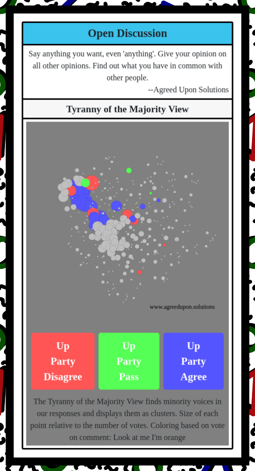 The Tyranny of the Majority View finds minority voices in our responses and displays them as clusters. Size of each point relative to the number of votes. Coloring based on vote on comment