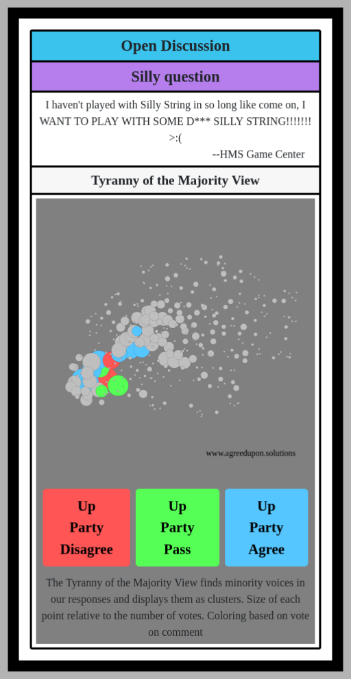 The Tyranny of the Majority View finds minority voices in our responses and displays them as clusters. Size of each point relative to the number of votes. Coloring based on vote on comment