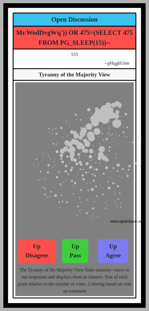 The Tyranny of the Majority View finds minority voices in our responses and displays them as clusters. Size of each point relative to the number of votes. Coloring based on vote on comment