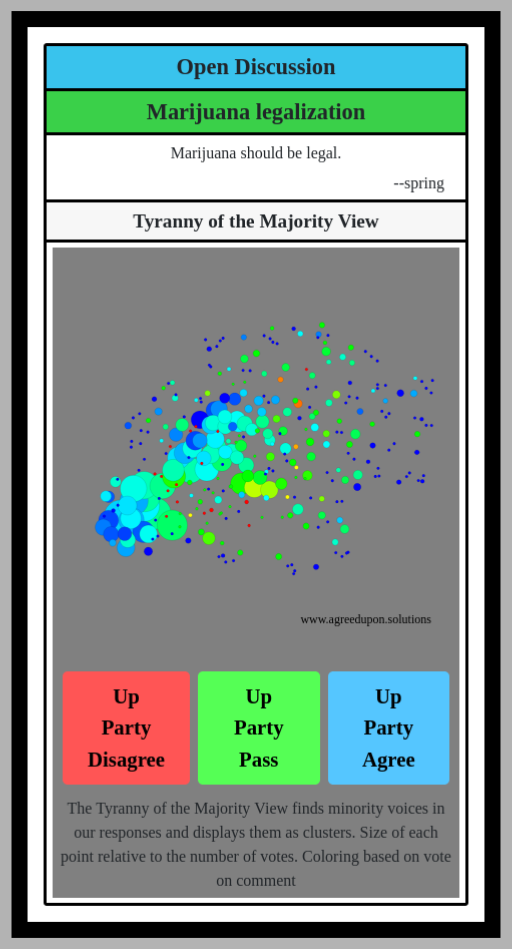 The Tyranny of the Majority View finds minority voices in our responses and displays them as clusters. Size of each point relative to the number of votes. Coloring based on vote on comment