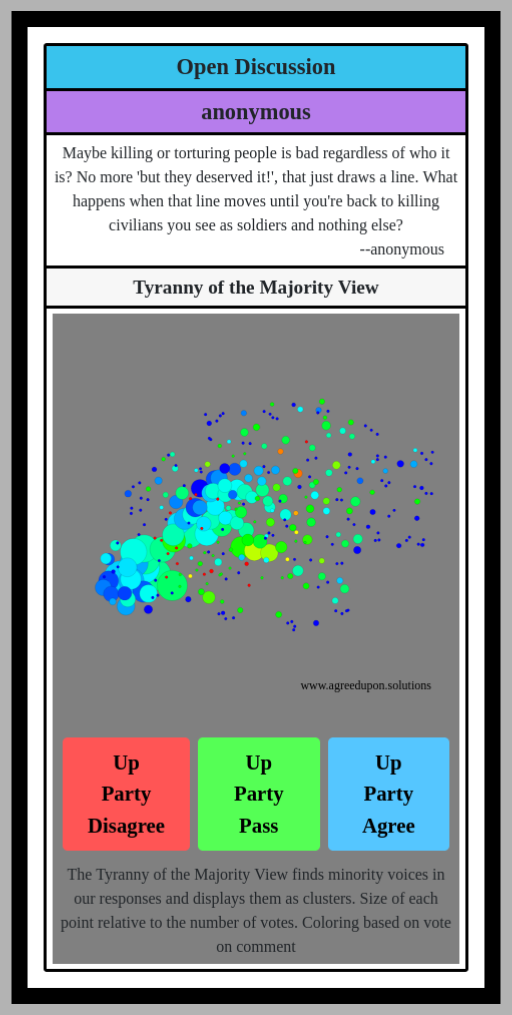 The Tyranny of the Majority View finds minority voices in our responses and displays them as clusters. Size of each point relative to the number of votes. Coloring based on vote on comment