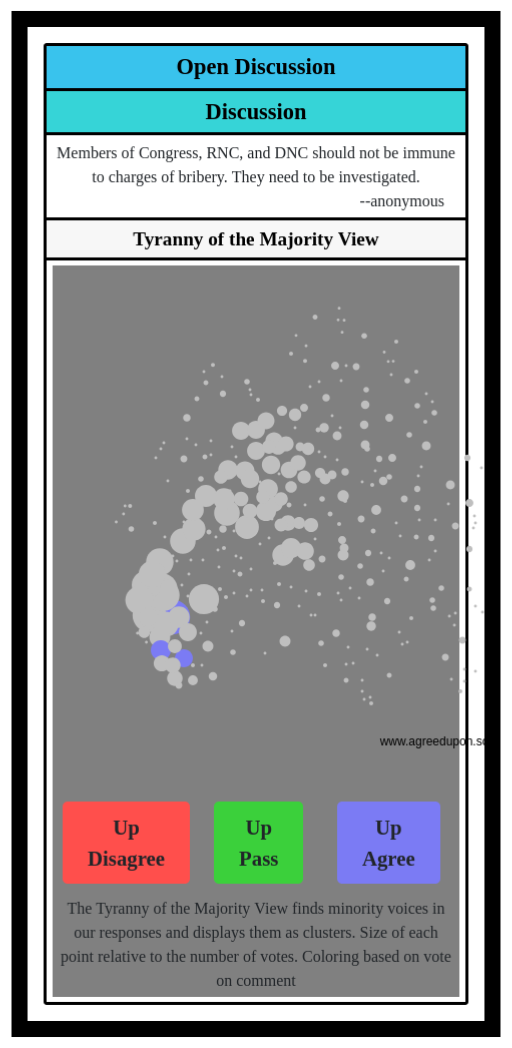 The Tyranny of the Majority View finds minority voices in our responses and displays them as clusters. Size of each point relative to the number of votes. Coloring based on vote on comment