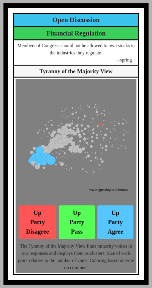 The Tyranny of the Majority View finds minority voices in our responses and displays them as clusters. Size of each point relative to the number of votes. Coloring based on vote on comment