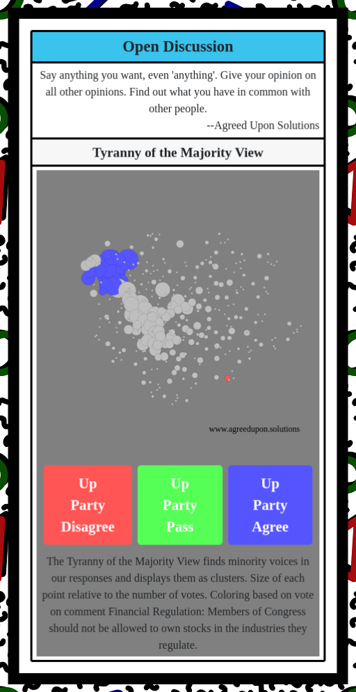 The Tyranny of the Majority View finds minority voices in our responses and displays them as clusters. Size of each point relative to the number of votes. Coloring based on vote on comment