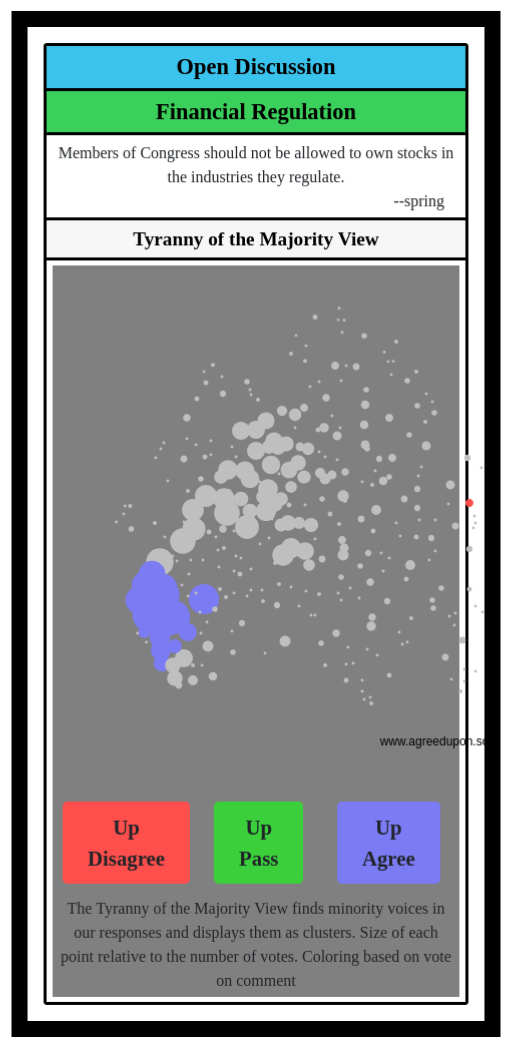 The Tyranny of the Majority View finds minority voices in our responses and displays them as clusters. Size of each point relative to the number of votes. Coloring based on vote on comment