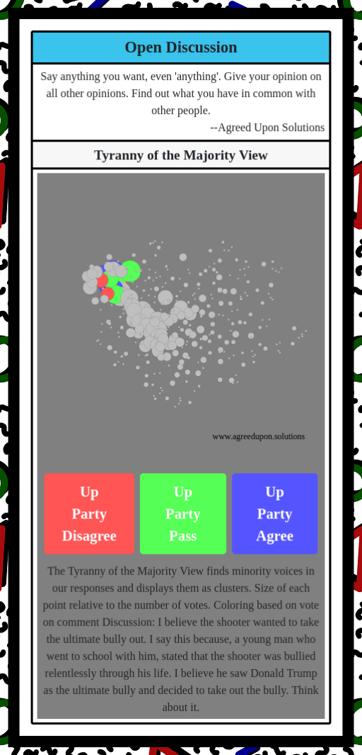The Tyranny of the Majority View finds minority voices in our responses and displays them as clusters. Size of each point relative to the number of votes. Coloring based on vote on comment