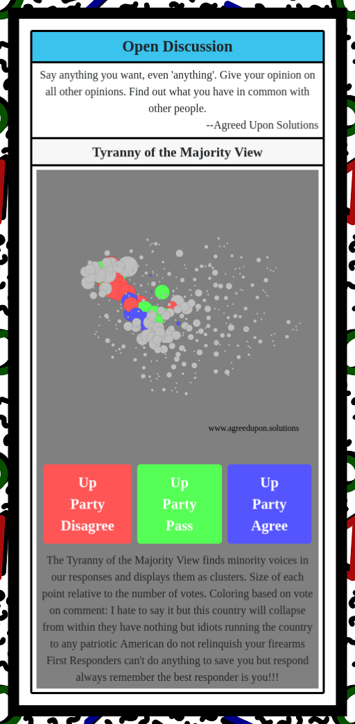 The Tyranny of the Majority View finds minority voices in our responses and displays them as clusters. Size of each point relative to the number of votes. Coloring based on vote on comment