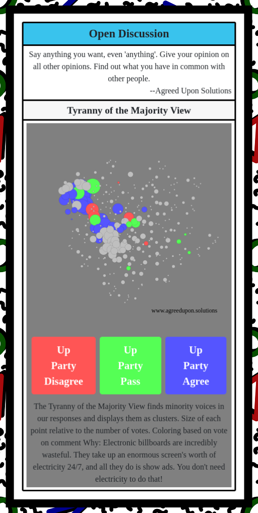 The Tyranny of the Majority View finds minority voices in our responses and displays them as clusters. Size of each point relative to the number of votes. Coloring based on vote on comment