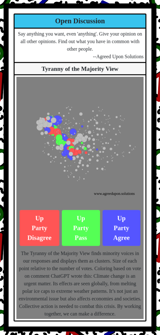 The Tyranny of the Majority View finds minority voices in our responses and displays them as clusters. Size of each point relative to the number of votes. Coloring based on vote on comment