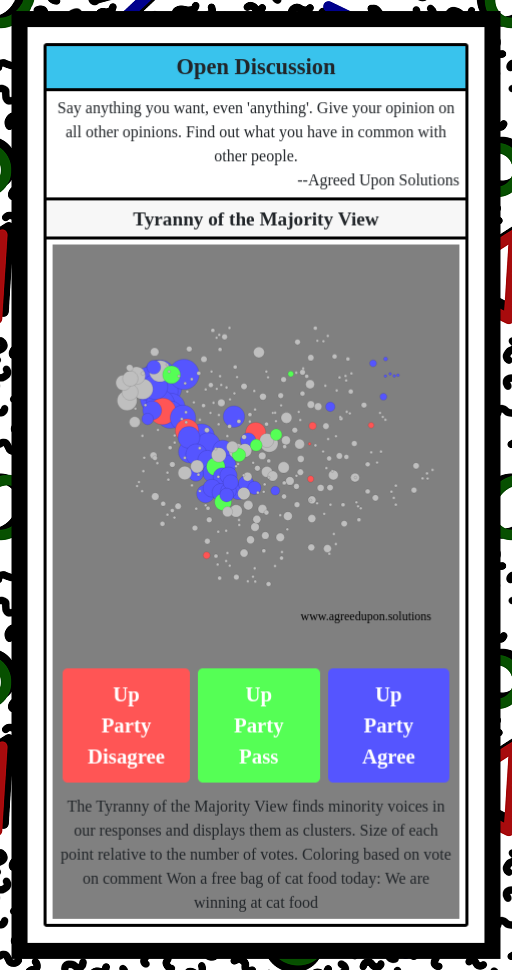The Tyranny of the Majority View finds minority voices in our responses and displays them as clusters. Size of each point relative to the number of votes. Coloring based on vote on comment
