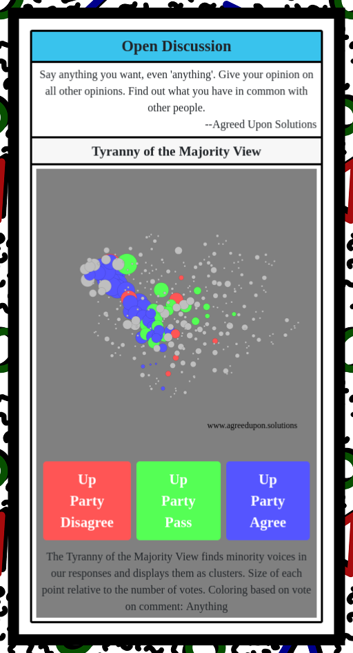The Tyranny of the Majority View finds minority voices in our responses and displays them as clusters. Size of each point relative to the number of votes. Coloring based on vote on comment