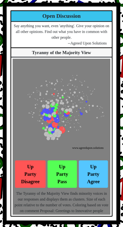 The Tyranny of the Majority View finds minority voices in our responses and displays them as clusters. Size of each point relative to the number of votes. Coloring based on vote on comment
