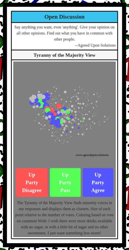 The Tyranny of the Majority View finds minority voices in our responses and displays them as clusters. Size of each point relative to the number of votes. Coloring based on vote on comment