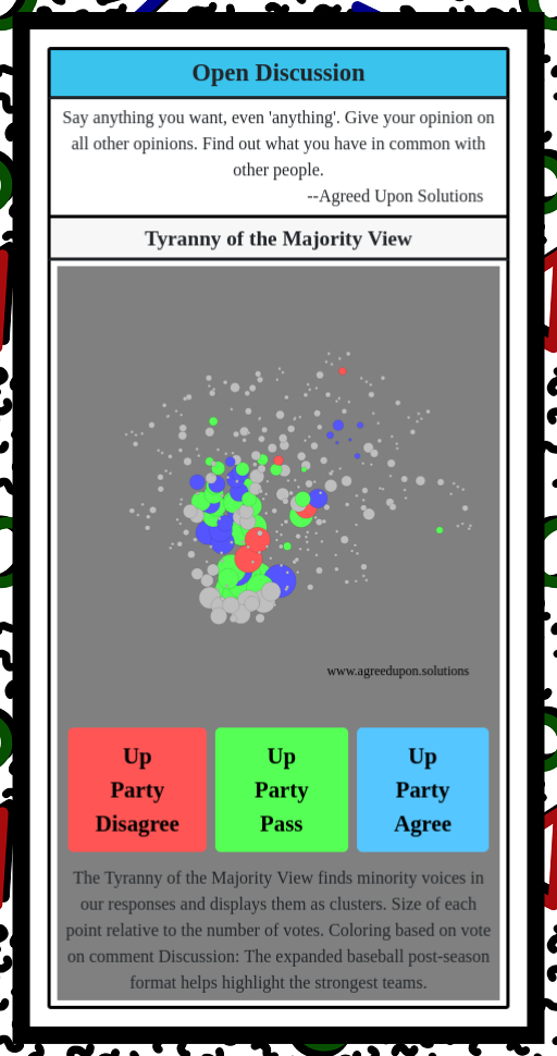 The Tyranny of the Majority View finds minority voices in our responses and displays them as clusters. Size of each point relative to the number of votes. Coloring based on vote on comment