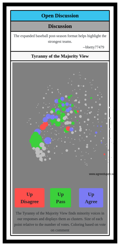 The Tyranny of the Majority View finds minority voices in our responses and displays them as clusters. Size of each point relative to the number of votes. Coloring based on vote on comment