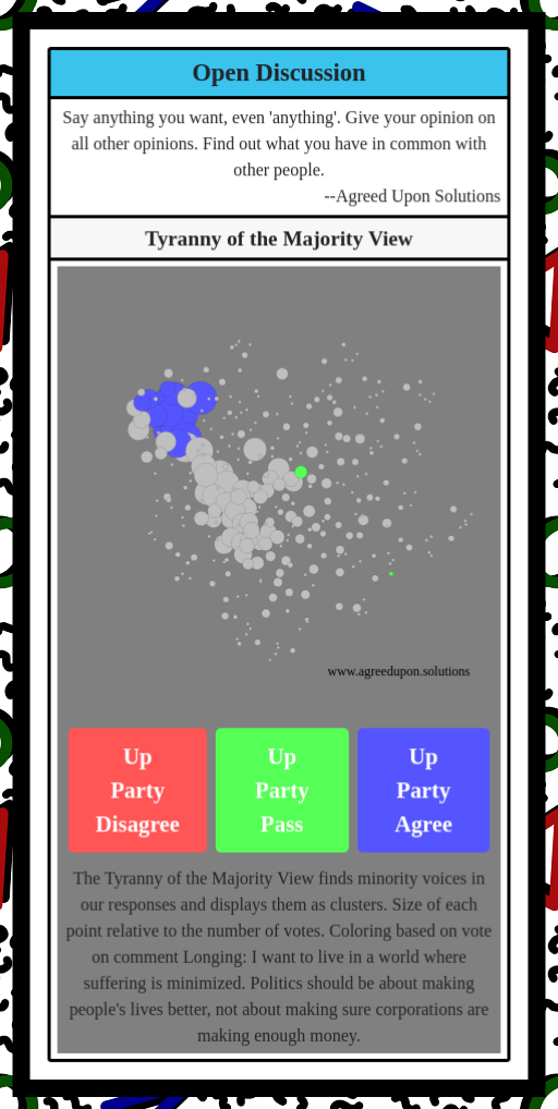 The Tyranny of the Majority View finds minority voices in our responses and displays them as clusters. Size of each point relative to the number of votes. Coloring based on vote on comment
