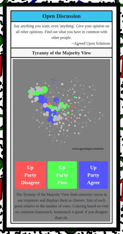 Say anything you want, even 'anything'. Give your opinion on all other opinions. Find out what you have in common with other people. --Agreed Upon Solutions