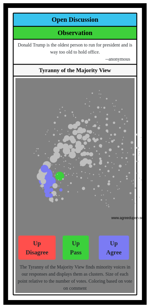 The Tyranny of the Majority View finds minority voices in our responses and displays them as clusters. Size of each point relative to the number of votes. Coloring based on vote on comment