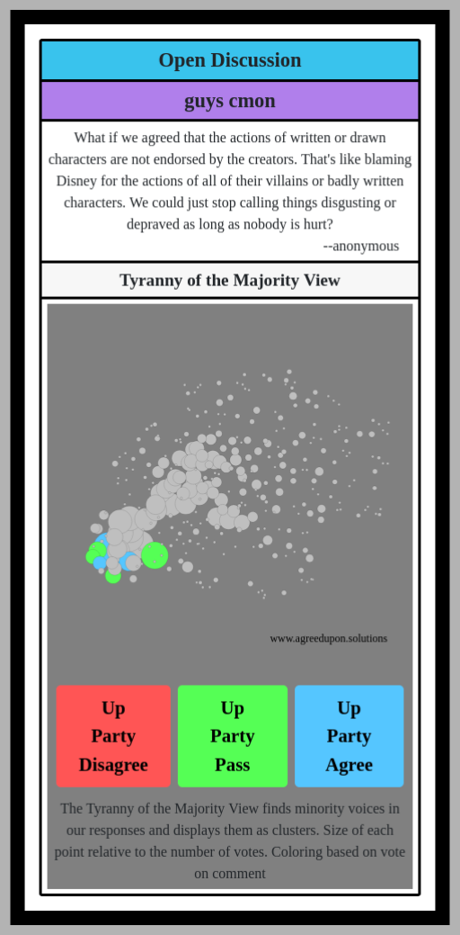The Tyranny of the Majority View finds minority voices in our responses and displays them as clusters. Size of each point relative to the number of votes. Coloring based on vote on comment