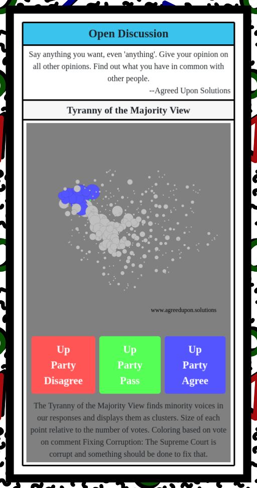 The Tyranny of the Majority View finds minority voices in our responses and displays them as clusters. Size of each point relative to the number of votes. Coloring based on vote on comment