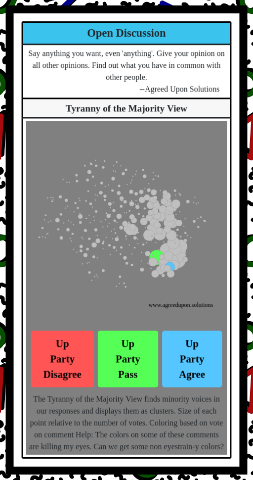 The Tyranny of the Majority View finds minority voices in our responses and displays them as clusters. Size of each point relative to the number of votes. Coloring based on vote on comment