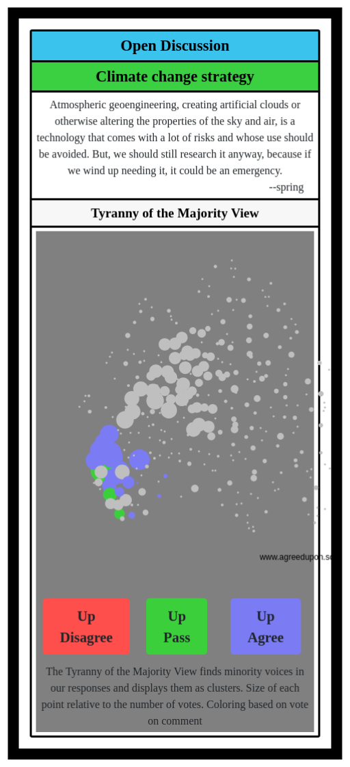 The Tyranny of the Majority View finds minority voices in our responses and displays them as clusters. Size of each point relative to the number of votes. Coloring based on vote on comment